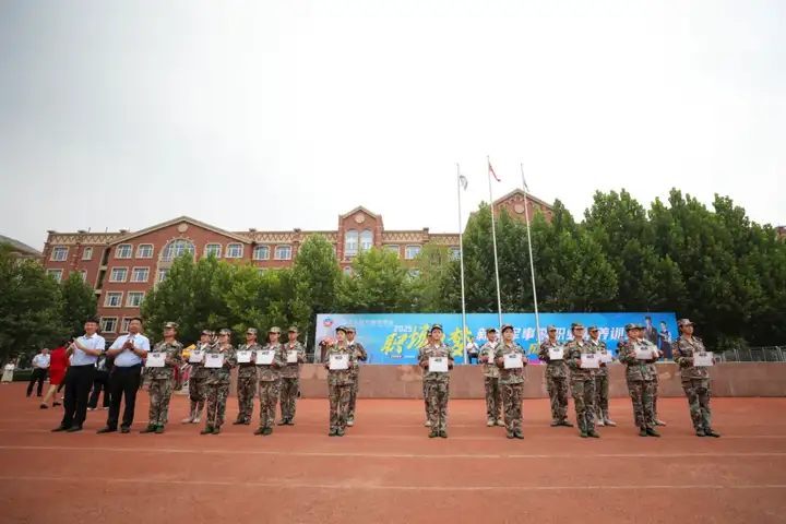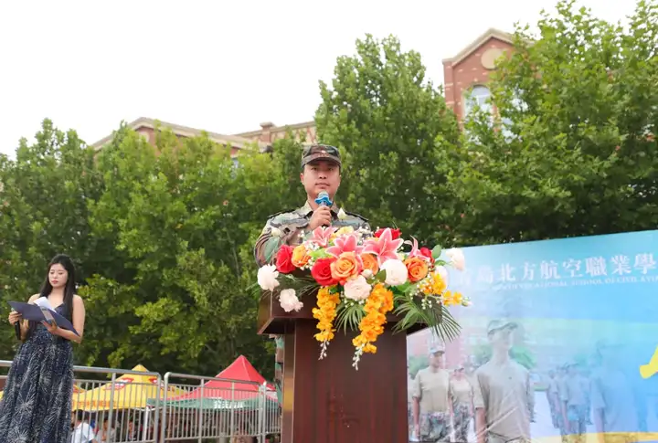 青岛北方航空职业学校执行校长向庆作2025年新生职场启梦军训汇报总结。他指出,职场启梦训练,锻炼的是身体,熔铸的是理想,磨练的是意志。经过一个多月的严格训练,同学们顶风雨、战酷暑,学会了吃苦与服从,坚持与忍耐。团结与合作,责任与担当,交出了一份合格的答卷。“希望同学们以此为起点,将训练中收获的吃苦耐劳的作风、令行禁止的纪律观念、团结协作的集体意识、永不言弃的拼搏精神融入到今后的学习生活和未来的职业生涯中。在青航这片沃土上,你们不仅要刻苦钻研专业知识、练就扎实技能,成为高度职业化的民航员工,注重修养、明礼诚信,塑造优雅品格,成为现代的绅士与淑女,更要心怀国家、勇于担当,将个人理想融入国家建设的大局,成为有理想、有本事、有担当的时代新人。”