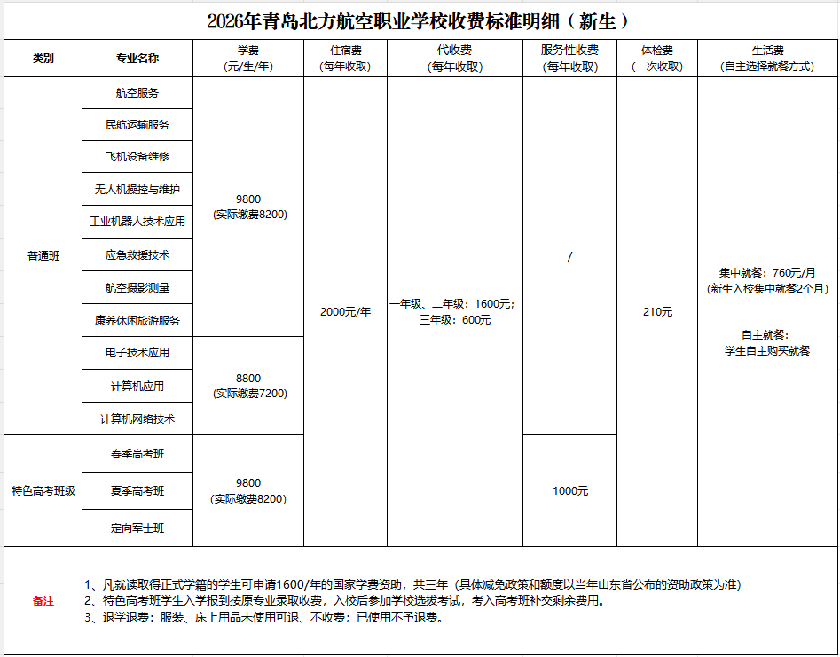2026年青岛北方航空职业学校收费标准明细(新生)